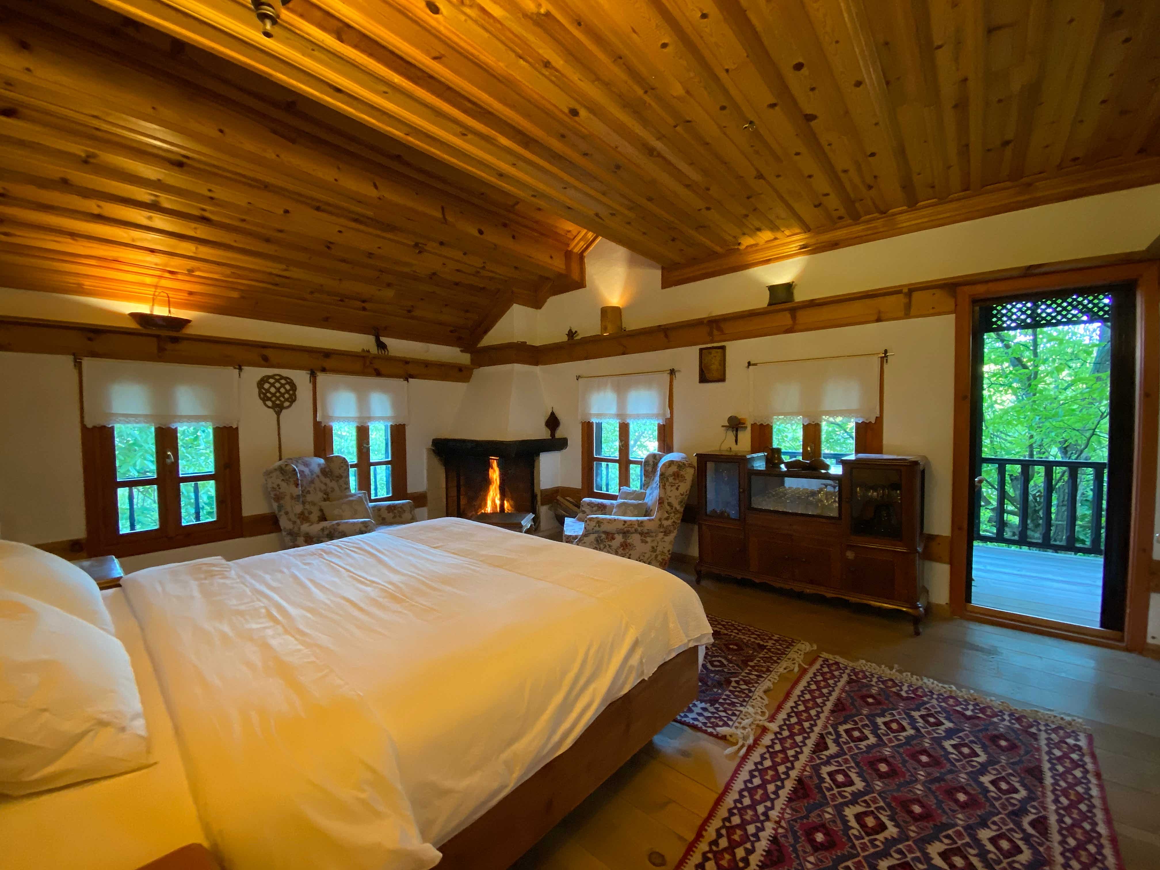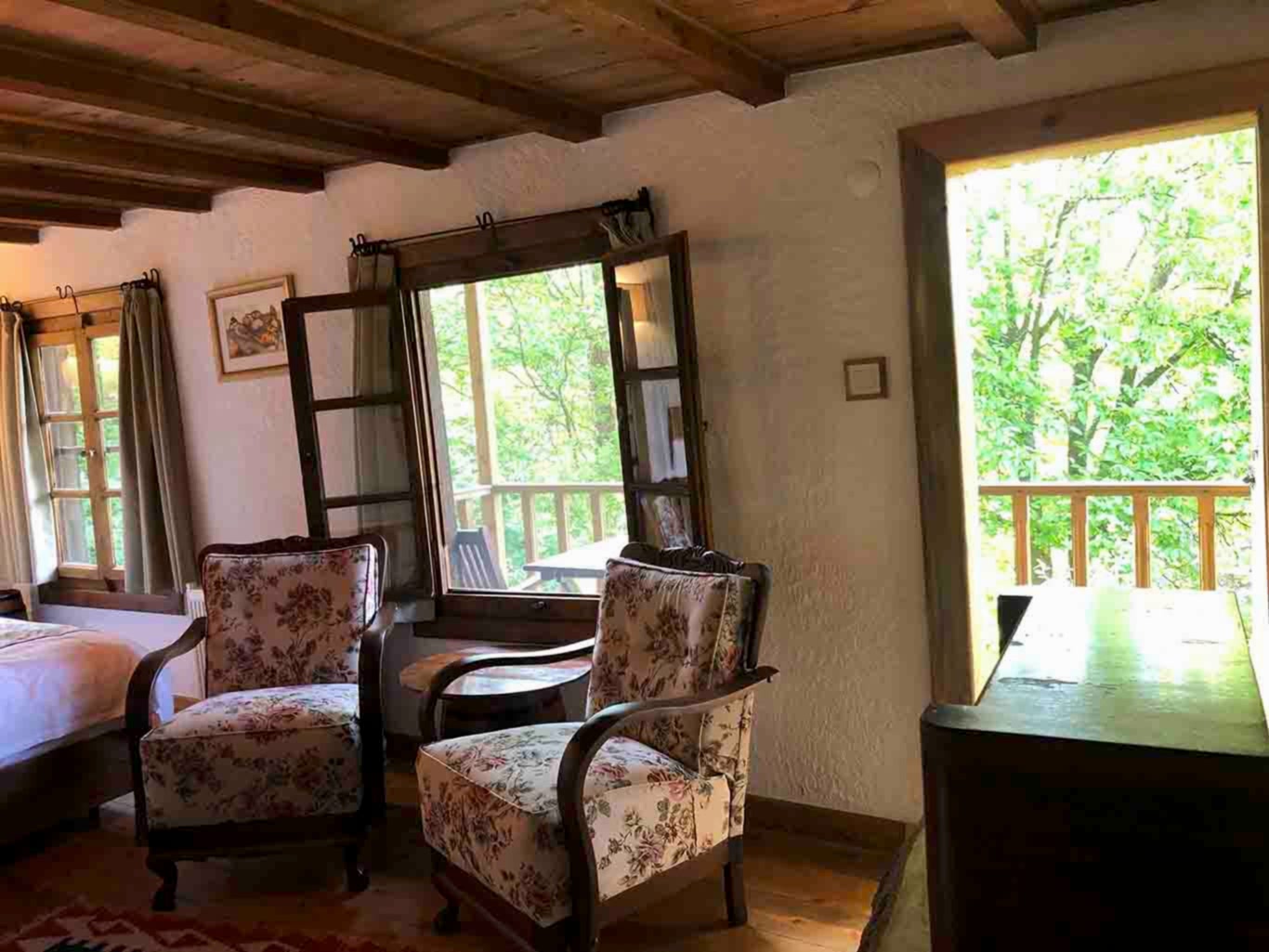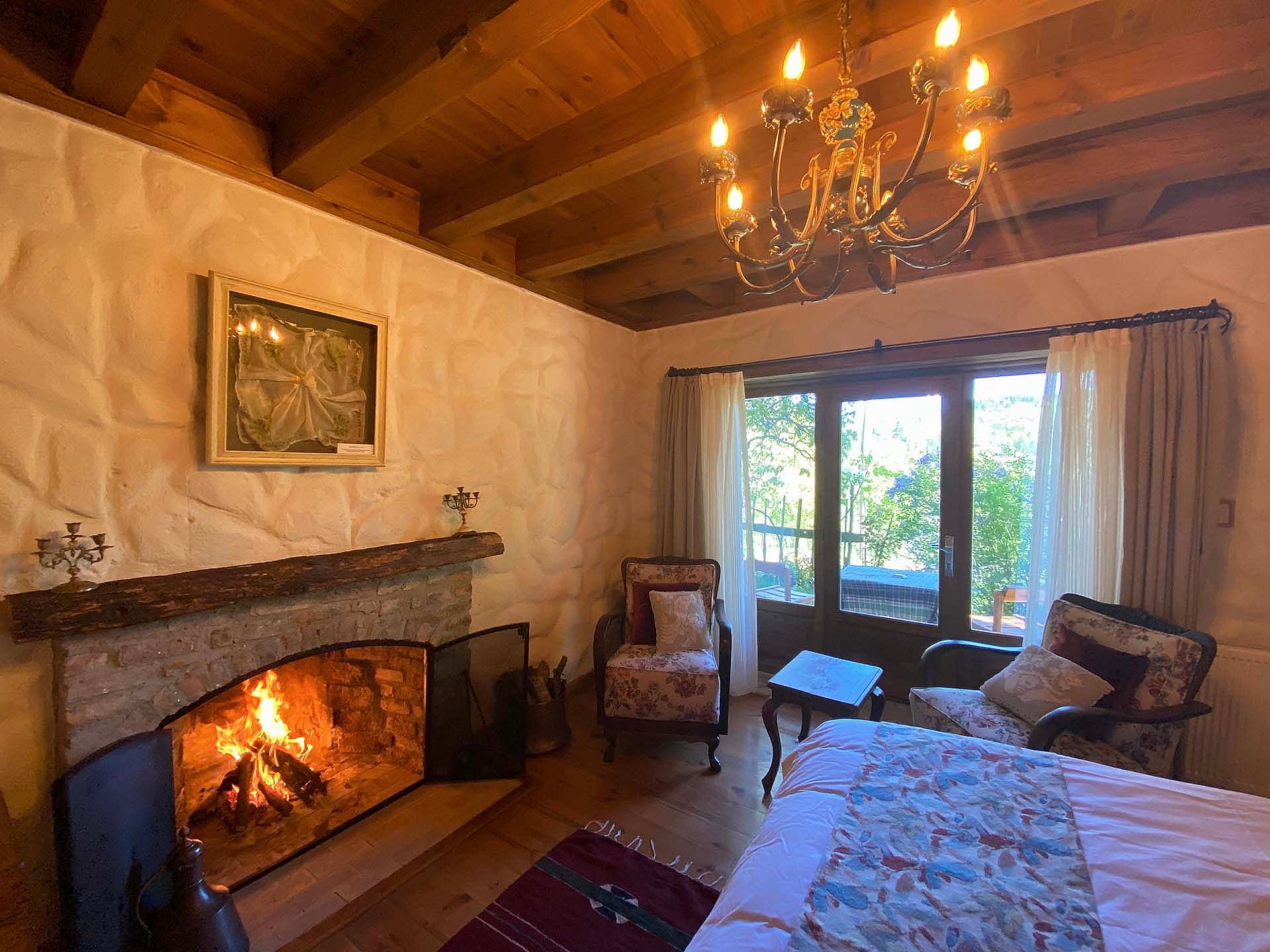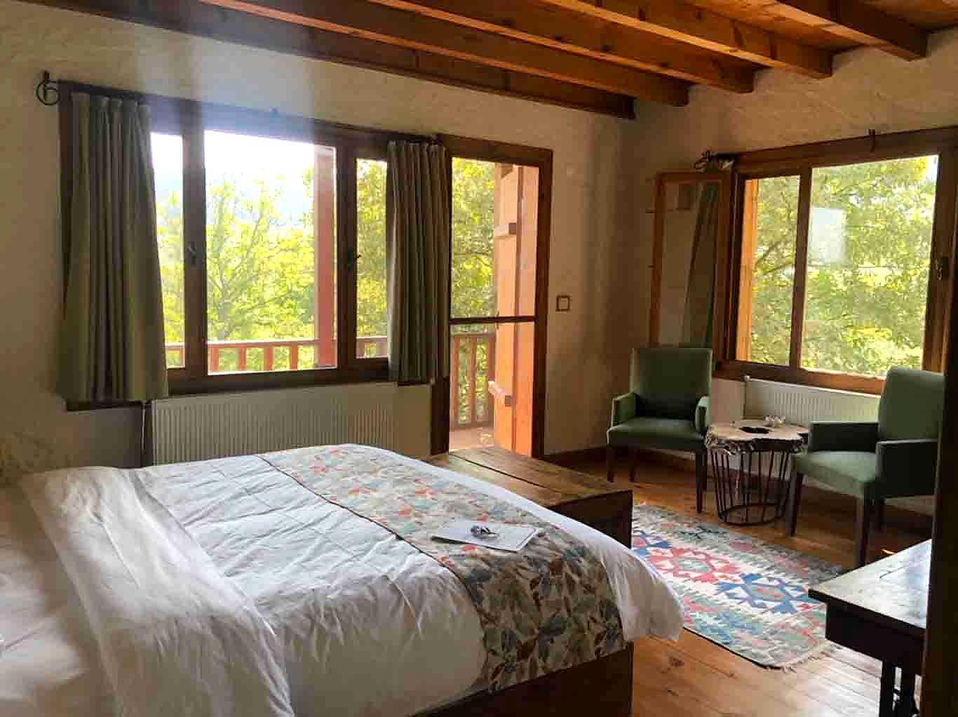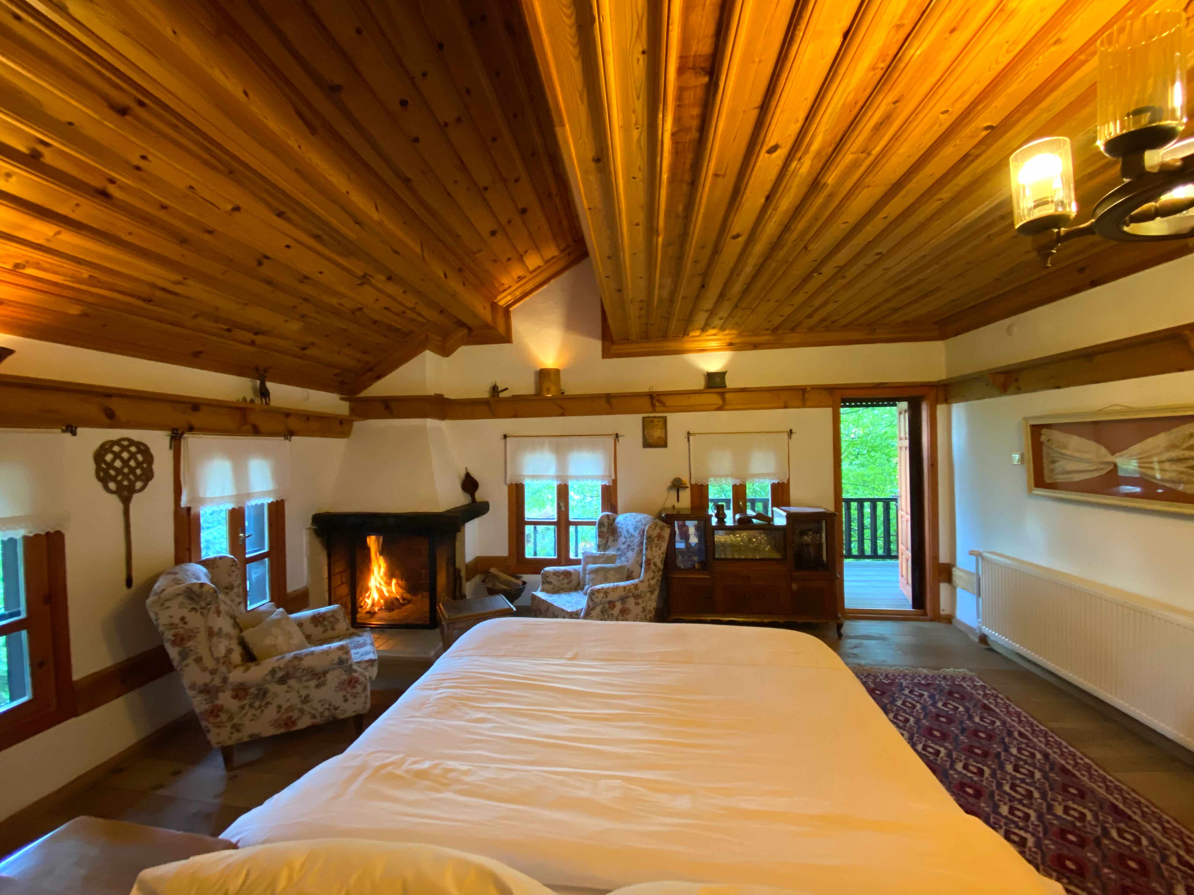 Taş evimizin 1. Katında yer alan odamız, camından ve büyük balkonundan etrafımızı çevreleyen ormana doğru sonsuz bir manzara sunar.. Balkonuna uzanan meşe ağacında, lezzetli meşe palamutlarının peşinden koşan sincaplara rastlamanız mümkün..