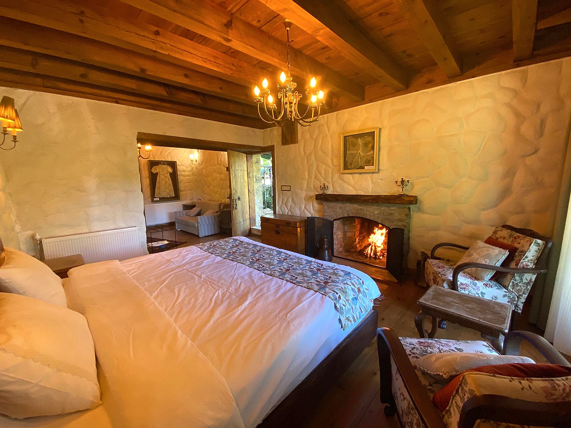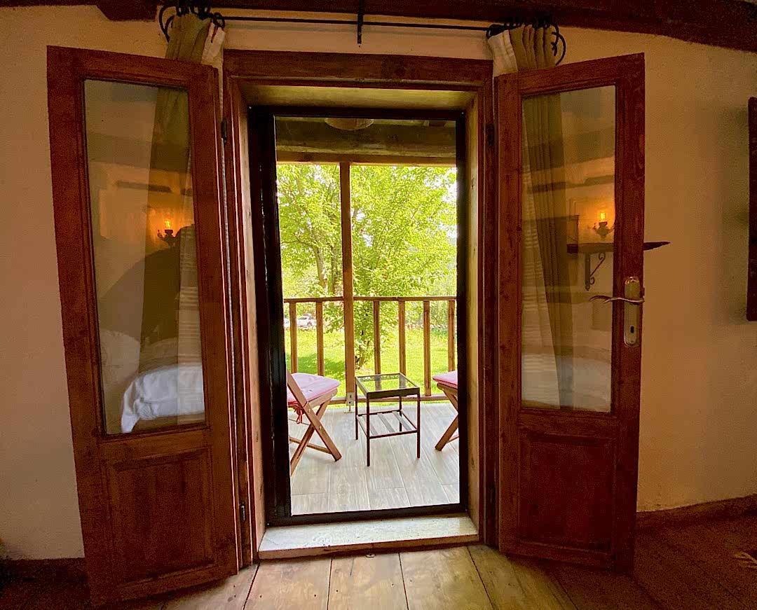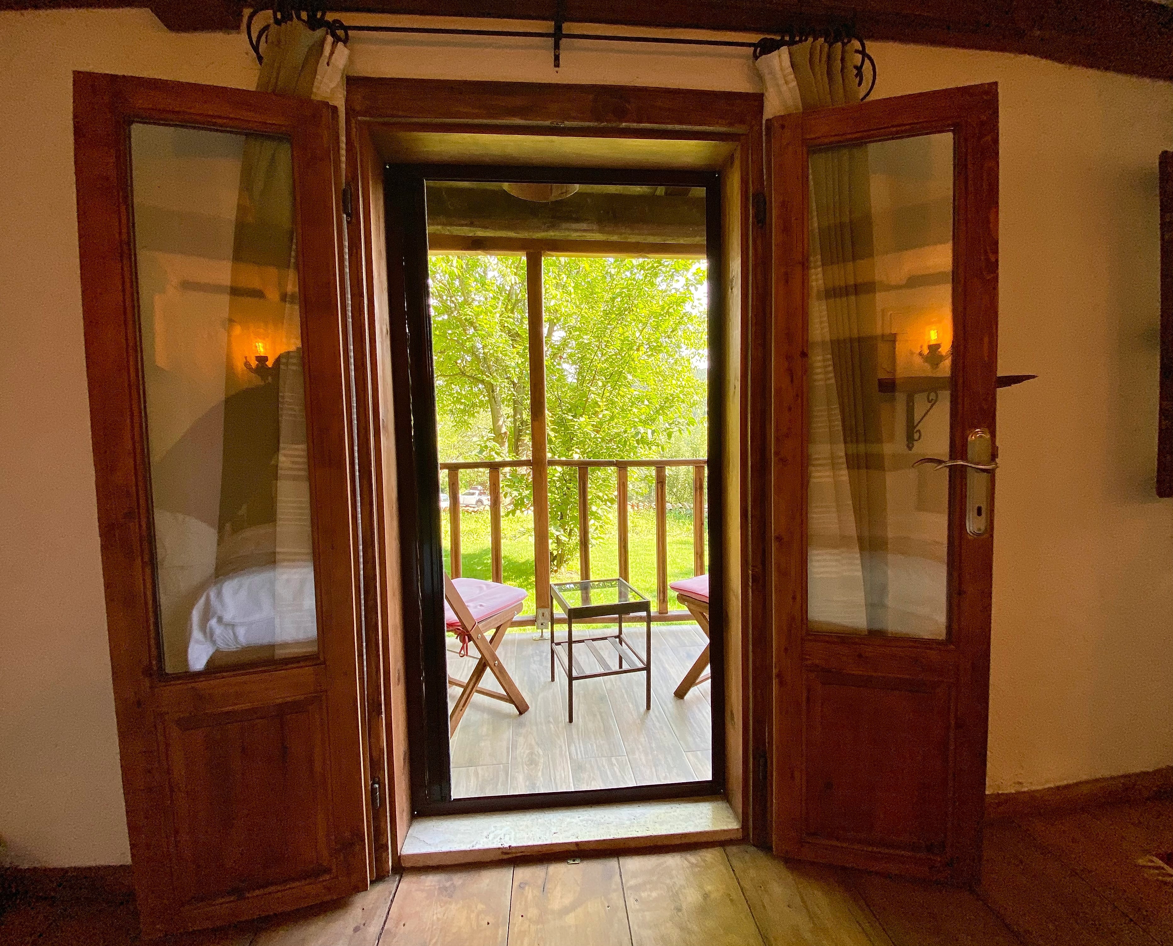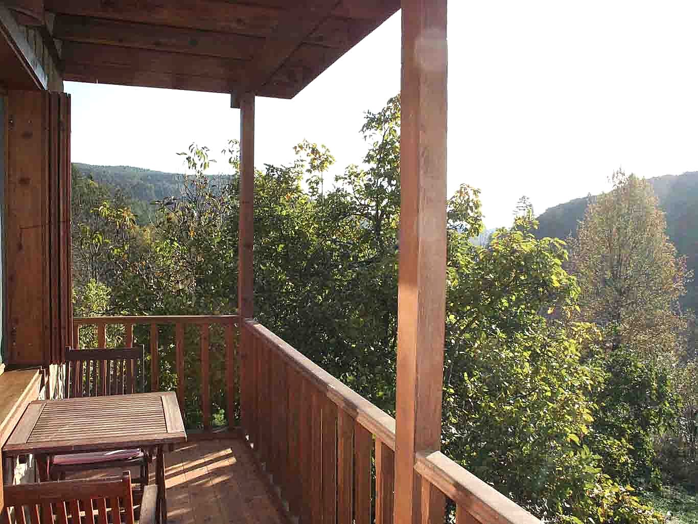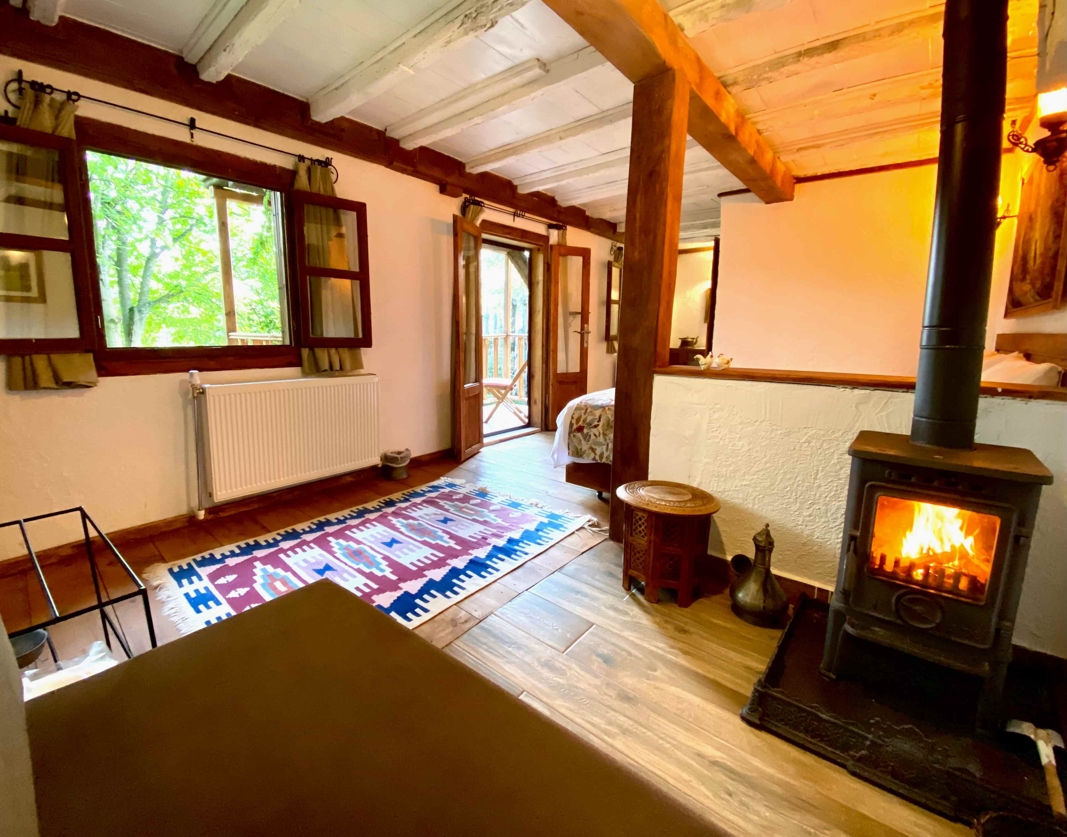 Taş evimizin 1. Katında yer alan odamız, camından ve büyük balkonundan etrafımızı çevreleyen ormana doğru sonsuz bir manzara sunar.. Balkonuna uzanan meşe ağacında, lezzetli meşe palamutlarının peşinden koşan sincaplara rastlamanız mümkün..