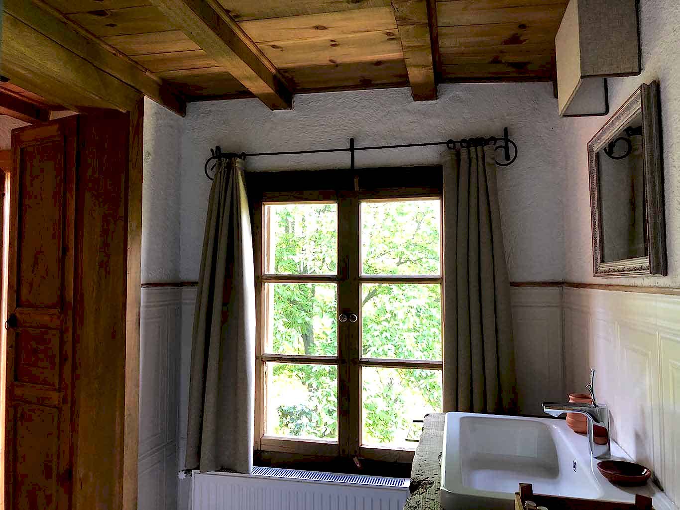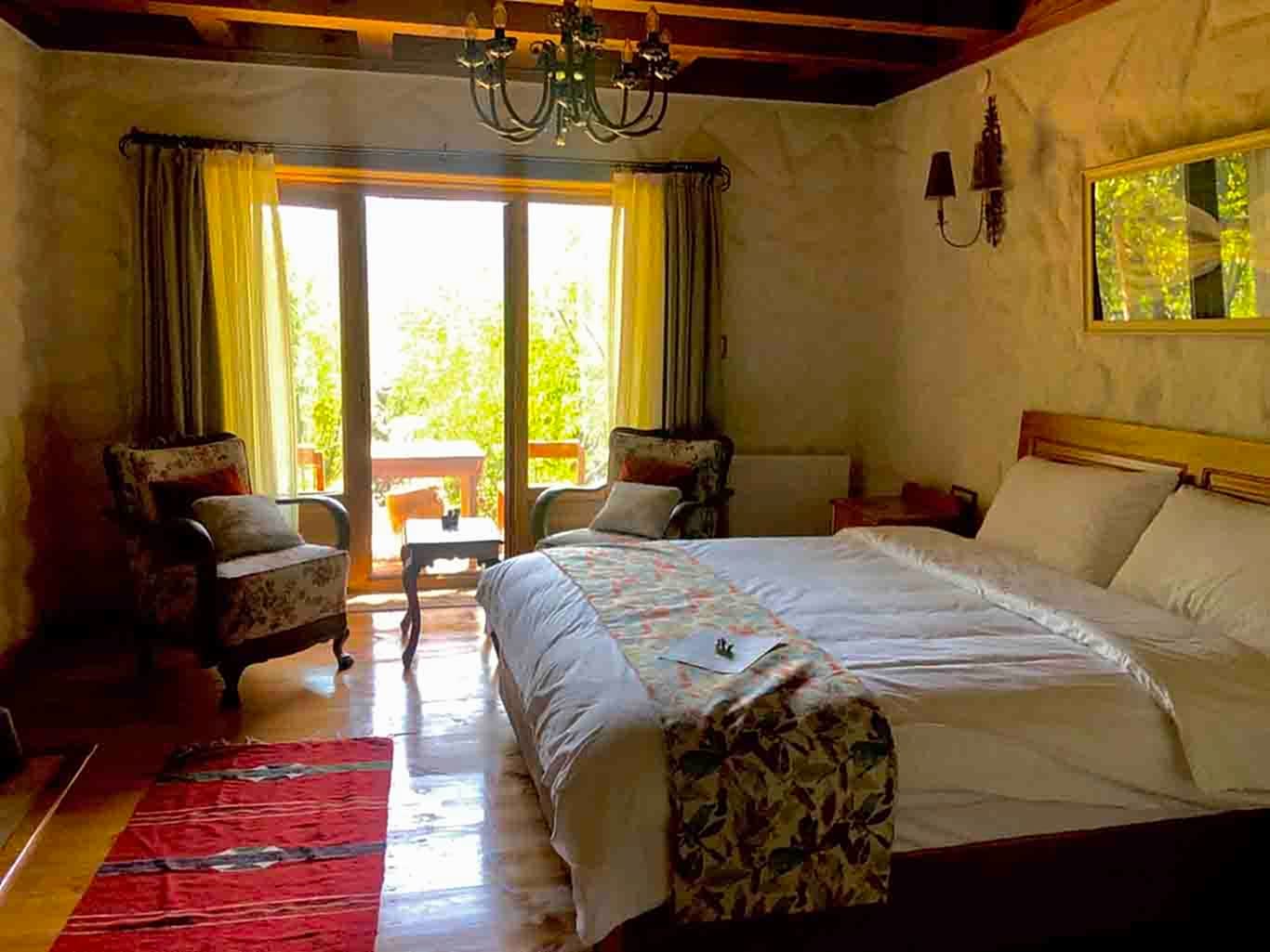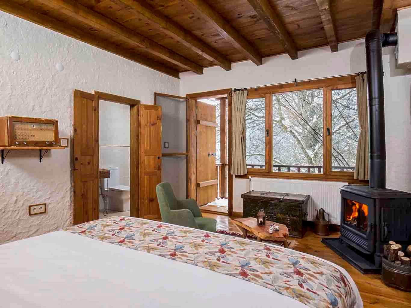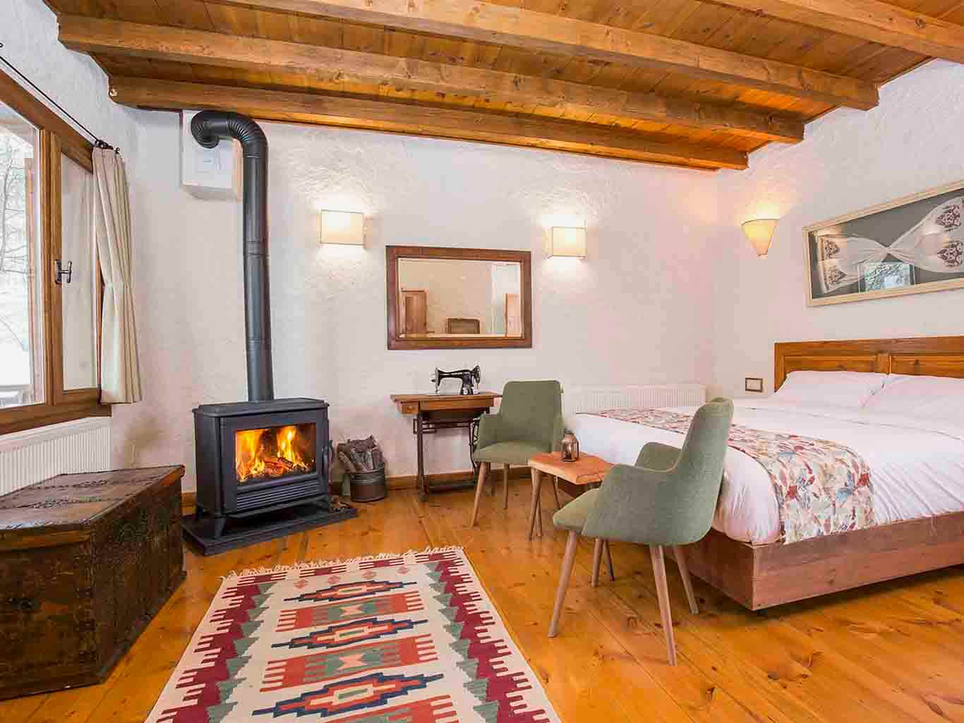 Taş evimizin 1. Katında yer alan odamız, camından ve büyük balkonundan etrafımızı çevreleyen ormana doğru sonsuz bir manzara sunar.. Balkonuna uzanan meşe ağacında, lezzetli meşe palamutlarının peşinden koşan sincaplara rastlamanız mümkün..